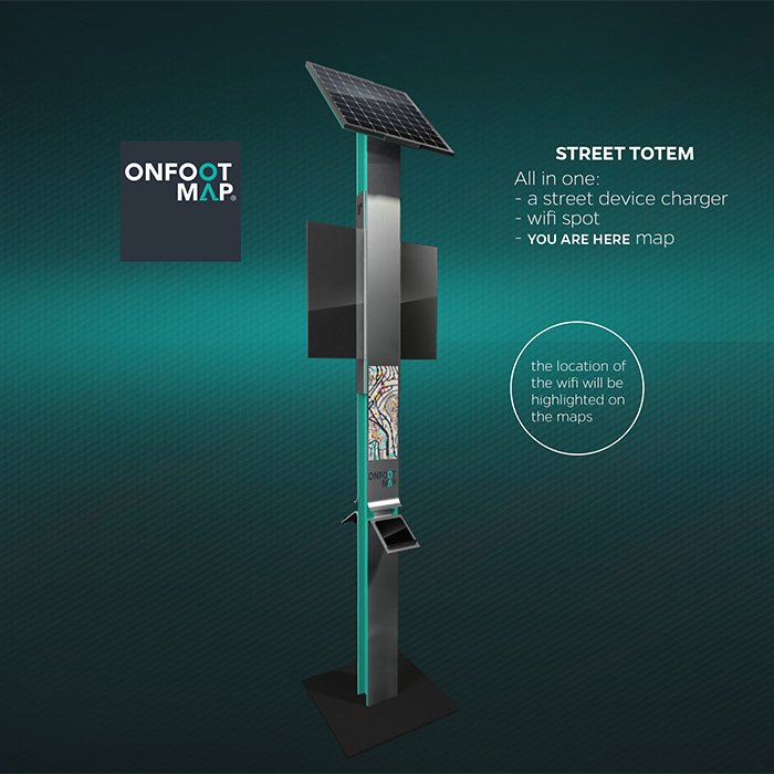 This solution, is maps based content for walking districts within our cities, designed from a pedestrian point of view, and presented through 4 different applications: Printed maps booklets. Website, where users can download or print the map they need. Mobile app. And a smart street totem, which contain location map and directions panel, it also provide a device power charger and WIFI spot, which all depends on solar power.